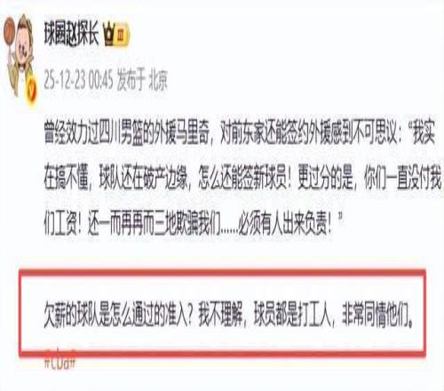 這就叫人無法理解了。既然依舊有欠薪,四川男籃未能還能繼續(xù)在CBA征戰(zhàn)呢?難怪媒體人球圈趙探長都看不下去了:“欠薪的球隊是怎么通過的準入?我不理解,球員都是打工人,非常同情他們?!?/p>