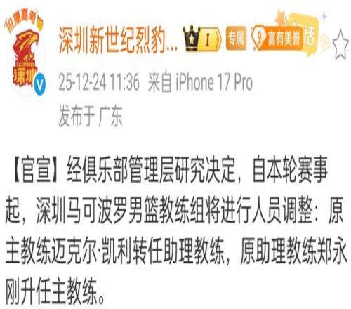然而讓人意想不到的是,本賽季第二位下個主帥是深圳男籃的外教凱利。根據(jù)深圳男籃官方公告,凱利確定下課,遼寧名宿鄭永剛走馬上任。有趣的是,這已經(jīng)是鄭永剛連續(xù)兩個賽季在賽季中途接手,上賽季他接替的是周鵬。