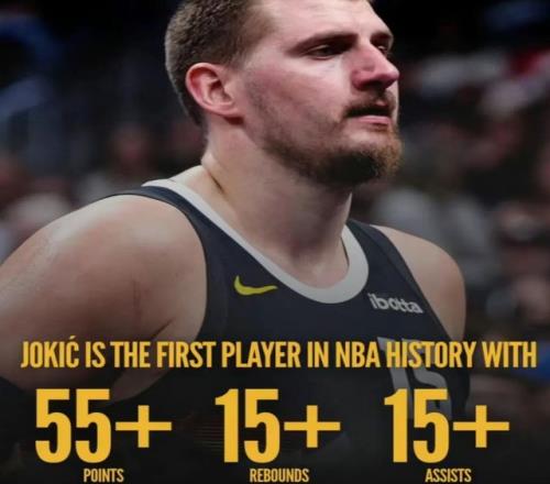 而在本場比賽之前,在上一場面對森林狼的比賽中,約基奇21中15,砍下更瘋狂的56分16籃板15助攻。55+15+15,NBA歷史第一,個人加時賽獨得18分,歷史第一。