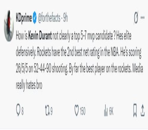 休媒:杜蘭特怎么能不算第7-5的MVP候選人呢?他的防守堪稱頂級,火箭隊凈勝分在NBA排第二,杜蘭特場均26+5+5,命中率52%,三分命中率44%,罰球命中率接近90%,他才是火箭最出色的球員,只能說NBA的媒體真的很討厭他。