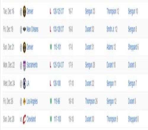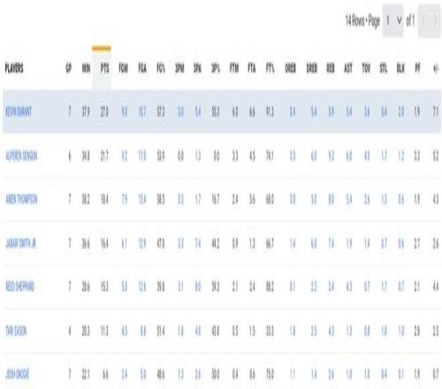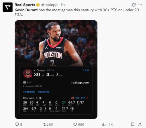 此役杜蘭特全場比賽28分鐘,17中11,三分4中2,罰球7中6,拿到30分7助攻4籃板,命中率64.7%,三分命中率50%,真實命中率74.7%,正負(fù)值+24,在申京缺席的情況下他成為球隊的進(jìn)攻/組織核心。
