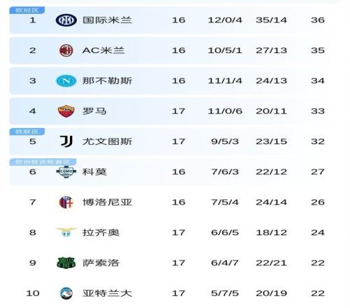 17輪過(guò)后,意甲堪稱爭(zhēng)冠最具懸念的五大聯(lián)賽。因?yàn)榍?名分差只有4分。目前,國(guó)米36分領(lǐng)跑,但只領(lǐng)先身后的同城死敵米蘭1分。