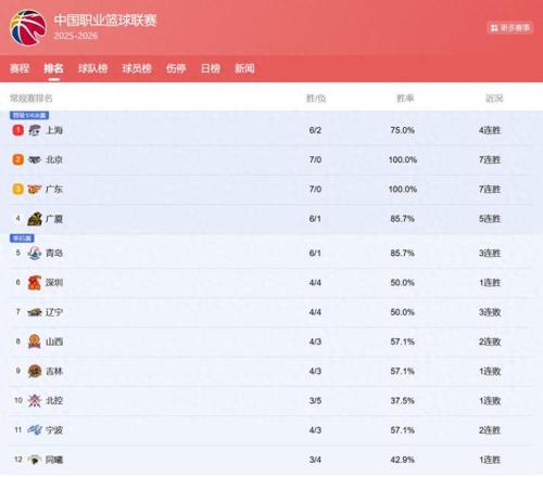 首先從最新的排名我們可以看到,目前上海隊(duì)排在榜首,北京隊(duì)排在第二,廣東隊(duì)排在第三。而廣廈隊(duì)這些球隊(duì)也都進(jìn)入了前五。對(duì)比之下,遼寧隊(duì)這些球隊(duì)則是沒(méi)有能夠進(jìn)入前五,排在第七名。另外,還有一支七連敗的球隊(duì)也已經(jīng)誕生。