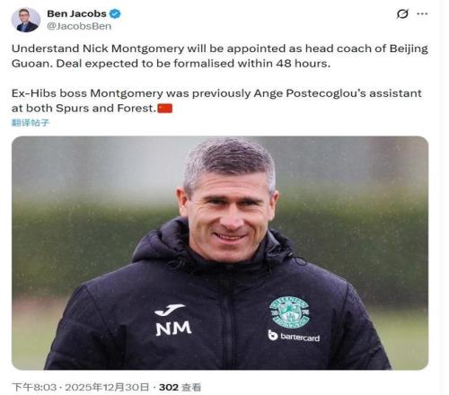 北京時(shí)間12月30日,來(lái)自知名記者雅各布斯(Ben Jacobs)的確認(rèn),44歲的蘇格蘭少帥尼克-蒙哥馬利,即將出任中超豪門(mén)北京國(guó)安主帥,預(yù)計(jì)正式協(xié)議在48小時(shí)內(nèi)簽署。