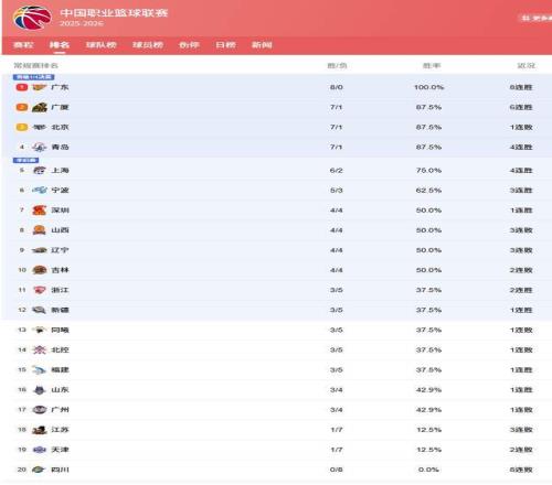 12月30日,隨著CBA常規(guī)賽第8輪全部戰(zhàn)罷,各隊(duì)之間的競(jìng)爭(zhēng)愈發(fā)激烈,積分榜的排名也漸趨明朗。廣東男籃客場(chǎng)輕松大勝天津隊(duì),8連勝高居第一,成為全聯(lián)盟唯一一支未嘗敗績(jī)的球隊(duì),可謂獨(dú)孤求敗。黑馬青島男籃居然高居第4位,和廣廈北京并駕齊驅(qū)。四冠王遼寧男籃就有點(diǎn)慘了,排名直接掉出了前8名。山東男籃大勝山西隊(duì)之后,排名也是連升3位。