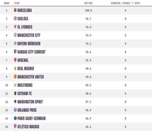 在女足俱樂部排名中,巴塞羅那女足以滿分100分高居榜首?;始荫R德里女足以90.6分位列全球第八,成功躋身由巴薩女足、切爾西女足、里昂女足等隊主導(dǎo)的世界頂級精英行列。