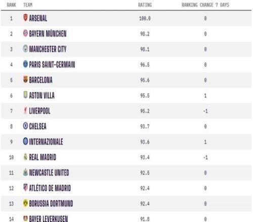 在男足排名中,阿森納以100分位居第一?;蜀R目前的評分為93.4分,位列全球第十,在近期排名中有所下滑。