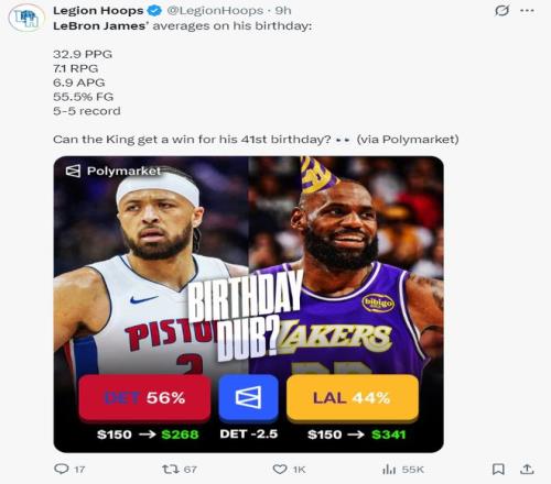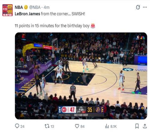 這場比賽是勒布朗-詹姆斯41歲的生日夜,詹姆斯生日夜場均32.9分7.1籃板6.9助攻,命中率55.5%,戰(zhàn)績是5勝5負,他是歷史生日夜場均得分最高的球員。