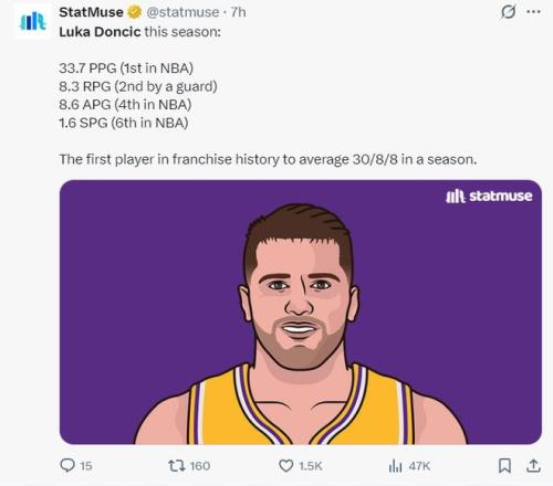 賽前數(shù)據(jù)媒體曬出東契奇本賽季場均33.7分聯(lián)盟第一,8.3籃板后衛(wèi)第二,8.6助攻聯(lián)盟第四,1.6搶斷聯(lián)盟第六,他成為湖人隊史首位30+8+8的球員。
