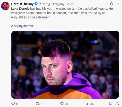 美媒HOTD(詹黑媒體):東契奇把青春時光浪費在了一些水平極低的球隊上(湖人)。他曾短暫效力于一直實力不錯的球隊(獨行俠),但被一位毫無能力的賣球鞋的總經(jīng)理交易掉了,太令人遺憾了。