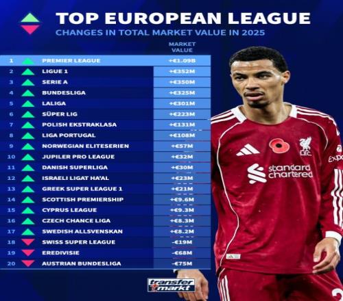 在2025年,英超市場(chǎng)價(jià)值增長(zhǎng)了10.9億歐元,達(dá)到了125億歐元,繼續(xù)成為世界足壇最有價(jià)值聯(lián)賽,也成為2025年市場(chǎng)價(jià)值增幅最大的聯(lián)賽。