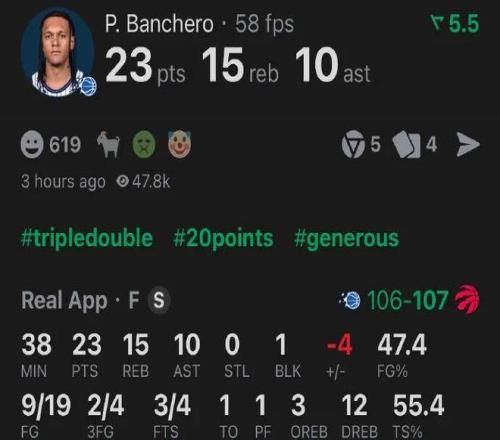 班凱羅又一次打出三雙,全場(chǎng)貢獻(xiàn)23分15籃板10助攻。