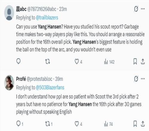 美國球迷:斯普利特看過楊瀚森的球員報告嗎?垃圾時間都這樣使用楊瀚森?你應(yīng)該為一個首輪16順位的新秀安排一個合理的問題,他最大的特點是三分弧頂持球指揮戰(zhàn)術(shù),而你根本不懂用他;