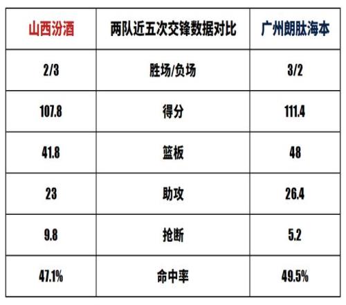 山西汾酒與廣州朗肽海本歷史上一共交手44次,山西汾酒23勝21負(fù)。上賽季兩隊(duì)交手2次,山西汾酒2勝0負(fù)。