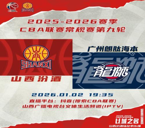 北京時(shí)間2026年1月2日19:35,2025-2026賽季CBA聯(lián)賽常規(guī)賽第九輪繼續(xù)進(jìn)行,山西汾酒迎來(lái)新年首戰(zhàn),主場(chǎng)對(duì)陣廣州朗肽海本,球迷觀眾可以通過(guò)抖音(搜索CBA聯(lián)賽)、山西廣播電視臺(tái)文體生活頻道(IPTV)觀看比賽實(shí)況,與我們一同觀看這場(chǎng)新年大戰(zhàn)!