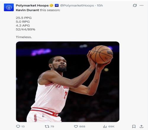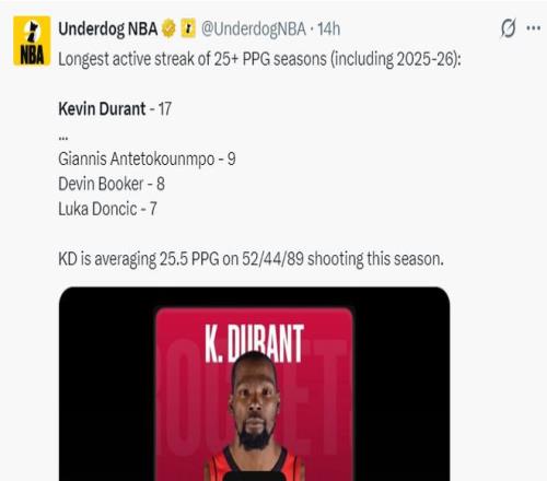 本賽季37歲的杜蘭特場(chǎng)均36分鐘(聯(lián)盟第四),場(chǎng)均25.5分5籃板4.5助攻0.8搶斷0.9蓋帽,命中率52.2%,三分命中率43%,罰球命中率89.6%,他的罰球只差0.4%就可以再度達(dá)成180俱樂部。