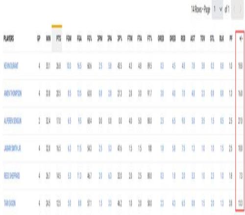 這一波四連勝,杜蘭特場(chǎng)均33.1分鐘,拿到26.8分4.8籃板7.8助攻0.3搶斷0.8蓋帽,命中率60.6%,三分命中率43.5%,正負(fù)值+18.8,四場(chǎng)比賽合計(jì)正負(fù)值+75火箭最高,就連火箭球迷追捧的伊森也只有+53。