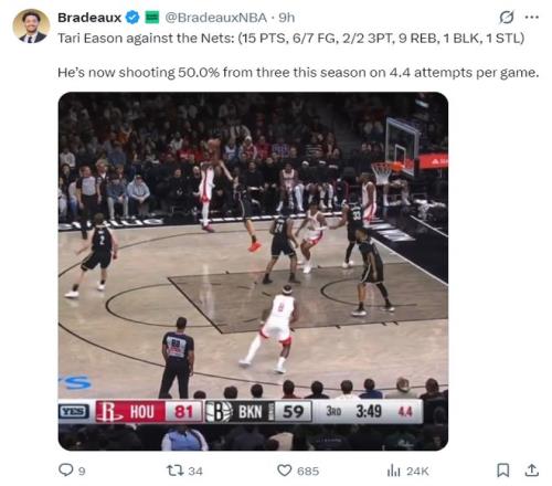 火箭記者Bradeaux寫道:伊森本賽季三分命中率接近五成,場均要出手4.4次三分球。