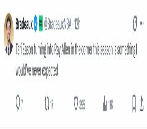 火箭記者Bradeaux繼續(xù)寫道:本賽季塔里-伊森的三分表現(xiàn)竟然跟雷阿倫如出一轍,這讓我意想不到。